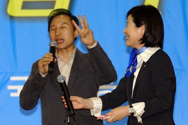 | ▲ 2007년 10월 30일 오후 제주시민회관에서 열린 한나라당 '국민성공 희망대장정 제주대회' 당시 김희정 의원과 이명박 대통령 후보의 모습. |