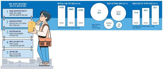 면적과 비용 측면에서 일반 가구보다 불리한 상황에서 출발해야 하는 청년가구를 위해 새 정부의 대책이 시급하다. 매일경제는 국내 보편적 주거복지 대안을 연구하는 전문 법인 한국주거복지포럼과 함께 청년 주거 문제 해결을 위한 5가지 방안을 마련했다.