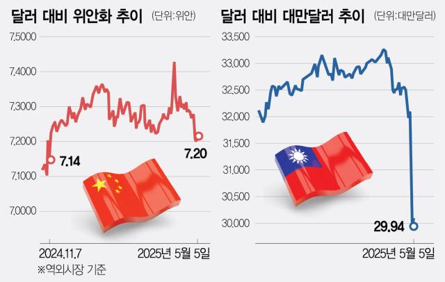 이런 글로벌 충격에도 아시아 통화는 강세를 보이고 있다. 노동절로 중국 증시가 휴장한 5일 역외 위안화 환율은 달러당 7.2위안 선을 돌파하며 지난해 11월 이후 최고치를 기록했다. 트럼프 대통령이 4일 NBC방송과의 인터뷰에서 “언젠가는 중국에 대한 관세를 낮출 것”이라며 “중국도 거래를 원하고 있다”고 했던 발언이 시장의 기대감을 자극했다는 분석이 나온다. 투자자들은 미중 협상 재개의 신호로 받아들였고 위안화 수요는 급증했다. 이 같은 기대감은 아시아 시장 전반으로 번졌다. 대만 달러는 이틀 만에 8% 급등하며 30년 만에 최대 상승 폭을 보였으며 싱가포르 달러도 동반 강세를 나타냈다.