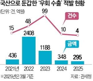 6일 관세청에 따르면 올해 불법적인 우회 수출 규모는 지난 3월까지 누적 295억원으로 집계됐다. 이 중 대미 우회 수출 적발액은 285억원으로 지난해 연간 적발액(217억원)을 넘어섰다. 지난 5년간 누적 적발액은 총 4675억원, 건수는 176건에 달했다. 과거에는 한국 제품의 좋은 이미지를 노리고 원산지를 한국산으로 바꿔 수출하는 사례가 많았다. 최근에는 미국의 높은 관세와 수입 규제를 피하기 위해 원산지를 한국으로 속여 수출하는 사례가 늘고 있다.