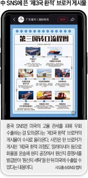 말레이시아, 베트남 등 아시아의 다른 국가를 통한 ‘택갈이’(상표 바꿔 달기)도 여전하다. 중국 수출 업체가 광저우, 샤먼 등 자국 내 항구에서 말레이시아 등으로 제품을 보내면 현지 공장이 협력해 원산지 증명서를 발급하는 방식이다. 환적국인 말레이시아에서 원산지 증명을 받았기 때문에 미국 항구 통관 때는 말레이시아산이 된다. 중국 SNS에는 이런 ‘원산지 세탁’을 대행해주겠다는 광고 글이 넘쳐난다.
