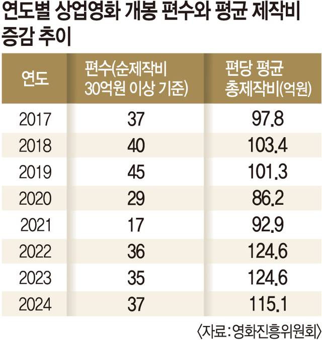 반면 팬데믹을 지나면서 제작비는 뛰었다. 2022년 순제작비 30억원 이상으로 제작·개봉한 상업영화 36편의 편당 평균 총 제작비는 124억원이 넘었다. 2019년 순제작비 30억원 이상 상업영화의 편당 평균 총 제작비는 100억원 수준이었다. 관객 수는 감소하고 제작비는 증가하는 추세가 이어지고 있다.