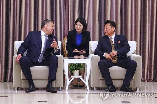 Paek Hyo Nam, right, vice-minister of External Economic Relations, listens to Belarusian Deputy Prime Minister Yuri Shuleiko speak as Shuleiko and his delegation arrive at the Pyongyang International Airport in Pyongyang, North Korea, Tuesday, May 6, 2025. (AP Photo/Cha Song Ho)