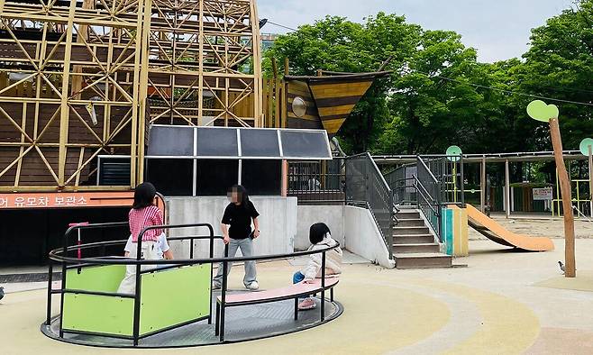 어린이날인 5일, 서울 노원구 ‘노해체육공원 통합놀이터’. 노란색 탄성포장재로 깔린 바닥 위에서 아이들이 뛰어다니는 소리와 웃음소리가 뒤섞였다. 한쪽에선 형형색색 옷을 입은 아이들이 미끄럼틀을 오르내리고, 다른 쪽에선 그네를 타며 신이 난 목소리로 재잘거렸다.