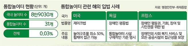 “모든 아동은 장애 유무나 장애 정도에 관계없이 차별받지 않고 놀 권리를 가진다.” 유엔 아동권리협약 제31조는 이렇게 장애아동의 놀 권리를 명시하고 있다. 이를 바탕으로 장애인차별금지추진연대, 장애물없는생활환경시민연대(무장애연대) 등 시민단체들과 일부 지방자치단체는 통합놀이터 설치에 공을 들여왔다.