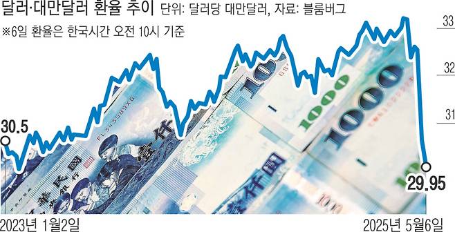 시장에서 미국과 무역협상을 진행 중인 대만이 협상에 우호적 여건을 만들기 위해 대만달러의 강세를 용인할 수 있다는 관측이 나오면서다. 외환시장이 크게 출렁이자 대만 정부는 지난 1일 워싱턴에서 미국과 환율 문제를 논의하지 않았다며 진화에 나서기도 했다.
