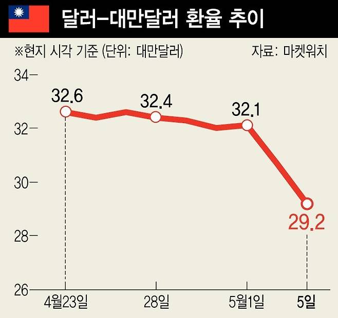 6일 마켓워치 집계를 보면 대만달러는 지난 1일 달러당 32.1대만달러에서 5일 29.2대만달러로 불과 2거래일 사이에 9.0% 하락(대만달러 가치 상승)했다.