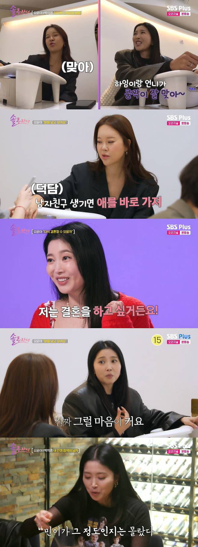 오윤아가 "올해 남자를 만나 내년에 시도하지 않으면 (임신은) 힘들다"라고 털어놓자 백지영은 "남자친구가 생기면 애를 바로 가져"라고 말했다. 오윤아는 진지한 눈빛으로 "사실 진짜 그럴 마음이 크다. 그런 건 옛날처럼 흉이 아닌 것 같다"라고 답했다.