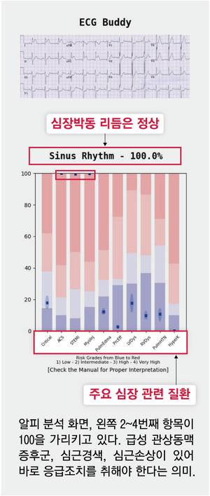 김중희 분당서울대병원 응급의학과 교수가 개발한 ‘ECG 버디(Buddy)’는 이 같은 문제를 해결해주는 인공지능(AI) 솔루션이다. 의사들이 종이나 모니터 화면으로 보던 심전도 그래프를 ECG 버디 애플리케이션(앱)으로 촬영하면 AI가 자동으로 분석해준다. 10가지 이상 주요 심혈관 질환의 위험도를 숫자로 보여준다. 지난해 식품의약품안전처 허가를 받았고, 현재 병원 20여 곳에서 사용되고 있다.