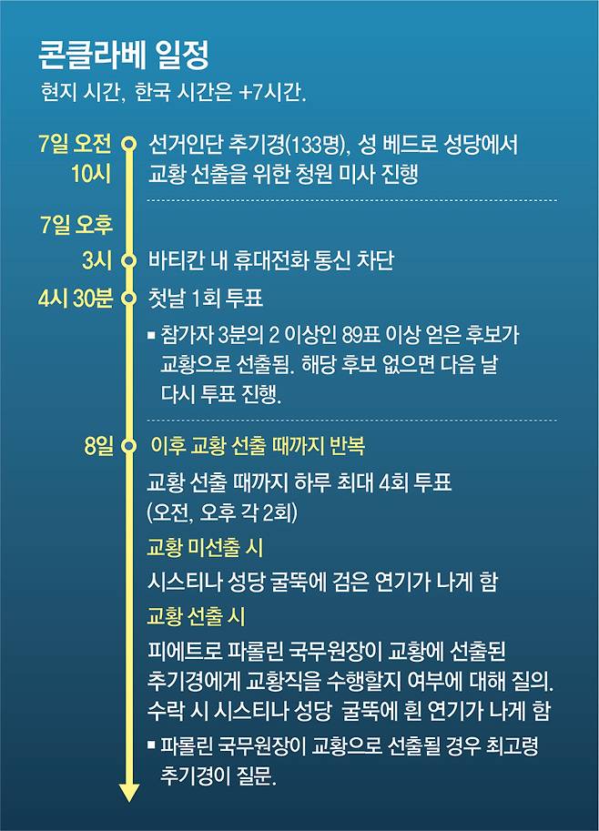 추기경단의 규모가 커지고 구성도 다양해지면서 교황 선출 결과는 더 가늠하기 어려워졌다는 전망이 나온다. 콘클라베는 3분의 2 이상의 지지를 얻는 후보가 나올 때까지 매일 투표를 되풀이한다. 프란치스코 교황, 그의 전임자 베네딕토 16세는 모두 콘클라베 둘째 날 교황으로 선출됐다. 이번에는 이보다 오래 걸릴 가능성이 크다는 전망이 많다.