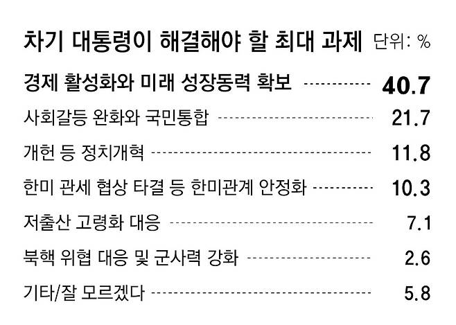 차기 대통령이 해결해야 할 최대 과제로는 ‘경제 활성화와 미래 성장동력 확보’(40.7%)가 가장 높았다. 이어 ‘사회 갈등 완화와 국민 통합’(21.7%), ‘개헌 등 정치 개혁’(11.8%), ‘한미 관세 협상 타결 등 한미 관계 안정화’(10.3%) 등의 순이었다.