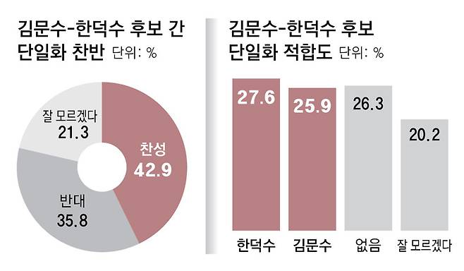 국민의힘에서 김 후보와 한 전 총리 간 단일화를 둘러싼 갈등이 확산되고 있는 가운데 김 후보와 한 전 총리 간 단일화 시 ‘어떤 후보가 더 적합하다고 생각하느냐’는 질문엔 김 후보가 25.9%, 한 전 총리가 27.6%로 오차범위 이내였다. 이재명 후보가 파기환송심에서 유죄 판결을 받을 경우 대선에 출마해야 한다는 응답(49.8%)과 출마하지 말아야 한다는 응답(48.1%)은 팽팽하게 갈렸다.