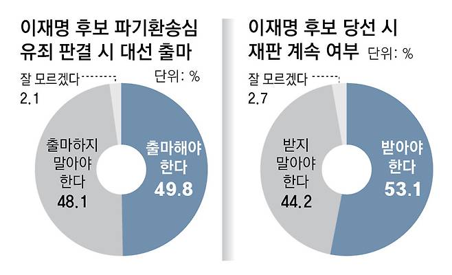 이재명 파기환송심 유죄 나오면… “그래도 출마해야” 49.8% “출마하지 말아야” 48.1%
