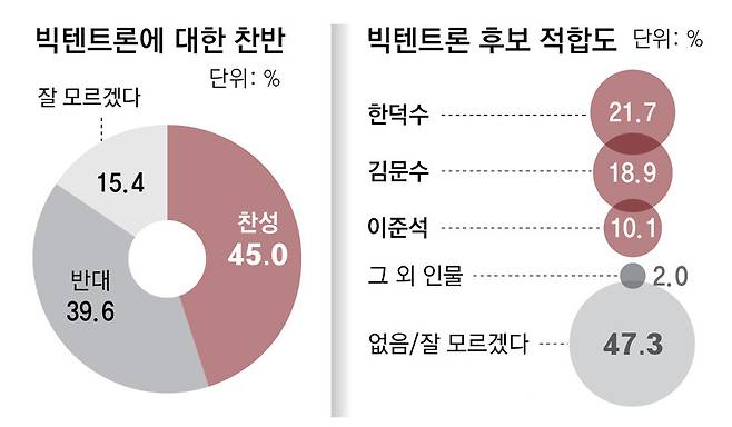 빅텐트가 성사될 경우 어떤 후보로 단일화되는 것이 적합하다고 보느냐는 질문에는 한 전 총리가 21.7%, 김 후보가 18.9%로 오차범위 내였다. 이어 이 후보가 10.1%의 지지를 얻었으며 그 외 인물은 2.0%, 유보층은 47.3%였다.