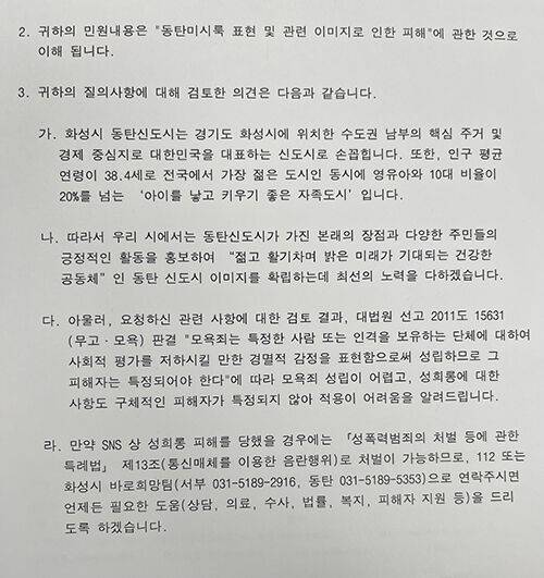화성시는 관련 민원 100여 건을 접수해 법적 검토에 나섰으나 명예훼손·모욕죄가 성립될 수 없어 법적으로 제지하기 어렵다는 답변을 내놨습니다.