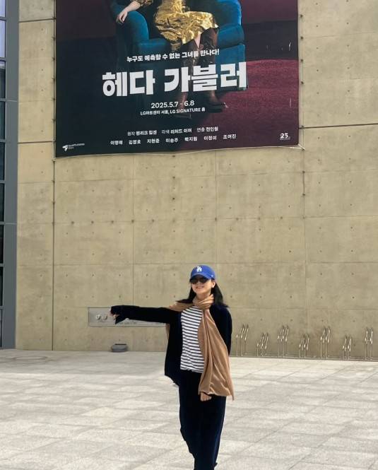 사진 속 이영애는 자신이 출연하는 연극 '헤다 가블러' 외벽 포스터 앞에서 포즈를 취하고 있다.