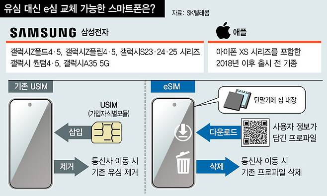 6일 이동통신업계 취재 결과, 국내에 출시된 스마트폰 가운데 이심 서비스를 지원하는 모델은 소수에 그친다. 애플은 중저가 라인(아이폰SE)을 포함해 2018년 이후 출시한 아이폰 모델에 이심을 지원하지만, 삼성전자는 2022년 출시한 갤럭시Z 폴드4·플립4을 시작으로 갤럭시S23·24·25 시리즈 등 플래그십(최고급 사양) 중심으로만 이심 서비스를 제공한다. 고령층이 주로 사용하는 갤럭시A 시리즈 등 중저가 모델에선 대부분 이심을 쓸 수 없다.