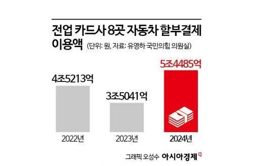 카드사들의 자동차 신용카드 할부 이용액이 지난해 5조원을 돌파하며 전년 대비 50% 이상 급증한 것으로 나타났다. 카드사 자동차 할부는 총부채원리금상환비율(DSR)에 포함되지 않아 가계부채 관리 사각지대에 놓여 있는 만큼 개선이 필요하다는 지적이 나온다.