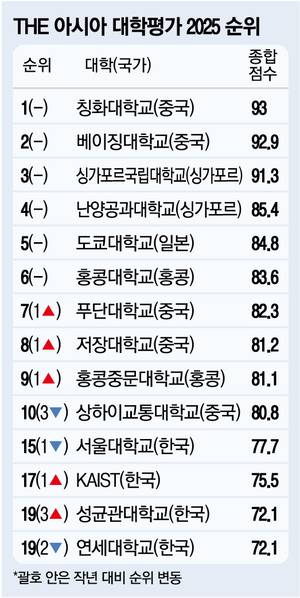 이번 아시아 대학평가에서는 중국 대학들의 강세가 두드러졌다. 전반적으로 순위에 큰 변화가 없는 상황에서 중국 본토 대학들이 작년과 동일하게 톱10 중 절반을 차지했다. 수년째 1·2위인 칭화대, 베이징대가 그대로 자리를 지켰고, 푸단대와 저장대가 한 칸 씩 오른 7, 8위를 기록했다. 중국 상하이교통대가 7위에서 10위로 하락했을 뿐 나머지는 큰 차이가 없었다. THE 측은 “올해 평가에서 역대 최고 순위를 기록한 중국 대학이 25개에 달했다”며 “중국 대학들의 경쟁력이 지속적으로 향상되고 있다”고 평가했다.