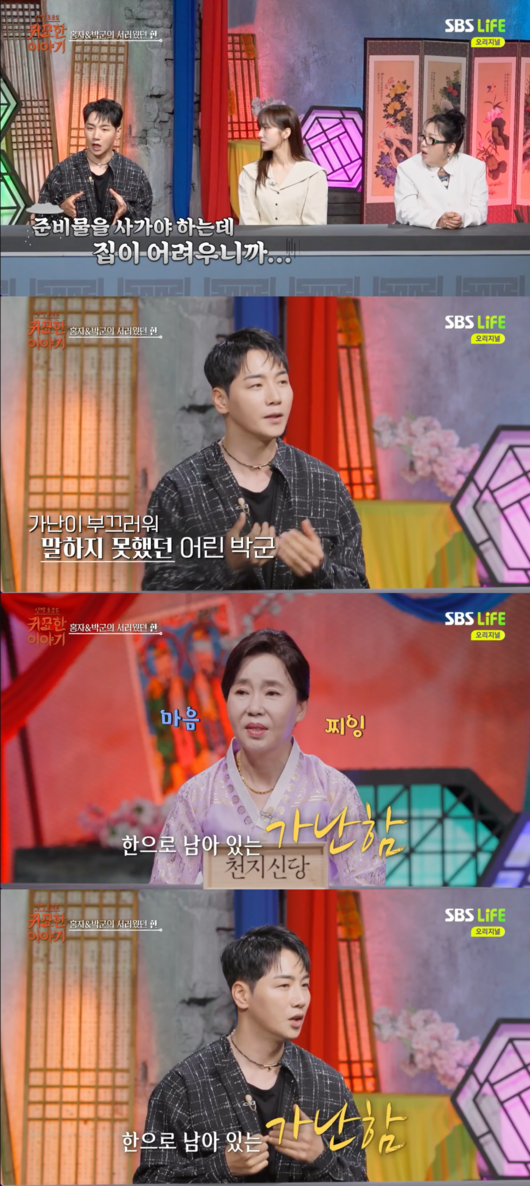박군은 "가난한 게 한이었다. 지금 생각해보면 제가 개구쟁이여서 초등학교 때 선생님한테 혼났던 게 아니고, 준비물을 사가야 하는데 집이 어렵다보니까. 비싼 준비물은 못 사갔다"라고 설명했다.