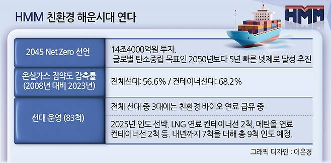 HMM의 ‘온실가스 집약도 감축률’은 2023년 기준(2008년 대비) 56.6%(전체 선대 기준). 컨테이너선대의 경우 68.2%에 다한다. 지난해 말 기준으로 컨테이너선 83척을 운항중인데, 이중 3대에 친환경 바이오 연료도 급유하고 있다. 올해 인도 선박 중 4척은 친환경 선박으로 여겨지는 LNG 연료컨테이너선(2척)과 메탄올 연료 컨테이너선(2척)이다. 메탄올 연료 컨테이너선의 경우 내년까지 7척을 더 인도해, 총 9척의 배를 인도받을 계획이다.