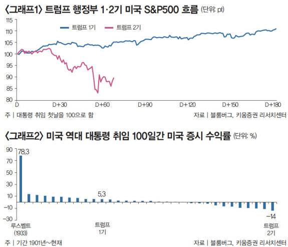 또 역대 대통령의 취임 후 100일 동안 주식시장 성과를 비교했을 때 이번 트럼프 2기 행정부가 역대 최악의 성과를 기록 중이라는 점도 눈여겨볼 부분이다(그래프2 참조). 주식시장 관련 발언을 어느 대통령보다 많이 쏟아낸 트럼프 대통령의 성향을 고려하면 지지율 하락과 함께 이 같은 주식시장 성과 부진도 계속해서 도외시하기 어려울 것이다.