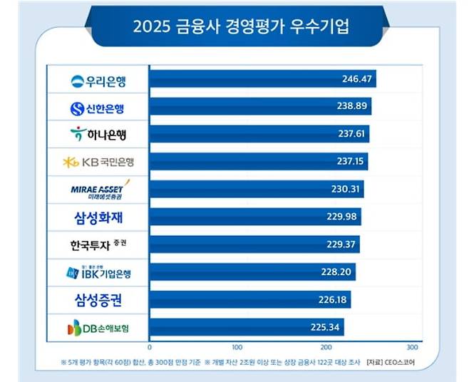 7일 기업데이터연구소 CEO스코어에 따르면 2024년 결산 기준 자산 2조원 이상 또는 상장 금융사 122곳을 대상으로 경영 평가를 한 결과 우리은행은 300점 만점에 최고점인 246.47점을 받아 종합 1위를 차지했다고 발표했다.