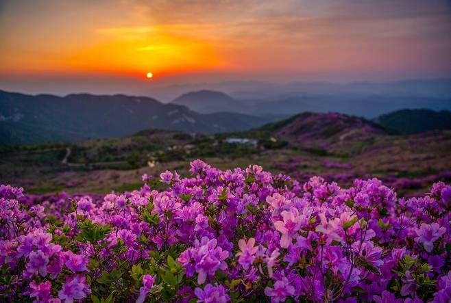 가을에는 억새가 주목받지만 봄철엔 진분홍 철쭉이 주인공이다. 지리산 바래봉, 소백산과 함께 우리나라 3대 철쭉 명산이다. 황매산 철쭉 군락지는 약 30㏊로, 국내 최대 규모를 자랑한다. 해발 1113m의 황매산 정상에서 내려다보는 분홍빛 철쭉 꽃바다가 탄성을 자아내게 한다. 수십만 평 고원에 펼쳐진 분홍빛 철쭉꽃 융단, 헤아릴 수 없이 많은 꽃송이가 바람에 일렁이며 빚어내는 색의 향연이 황홀하다.