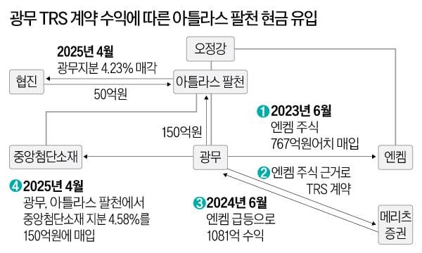 엔켐 계열은 증권사 파생계약을 활용해 상당한 시세차익을 거뒀다. 메리츠증권과 맺은 총수익스와프(TRS) 계약을 통해서다. 광무는 엔켐 주식 시세와 연동되는 TRS 계약을 통해 1081억원의 막대한 수익을 거뒀다. 지난달 아틀라스팔천에서 중앙첨단소재 지분을 사오는 자금도 여기서 나왔다.