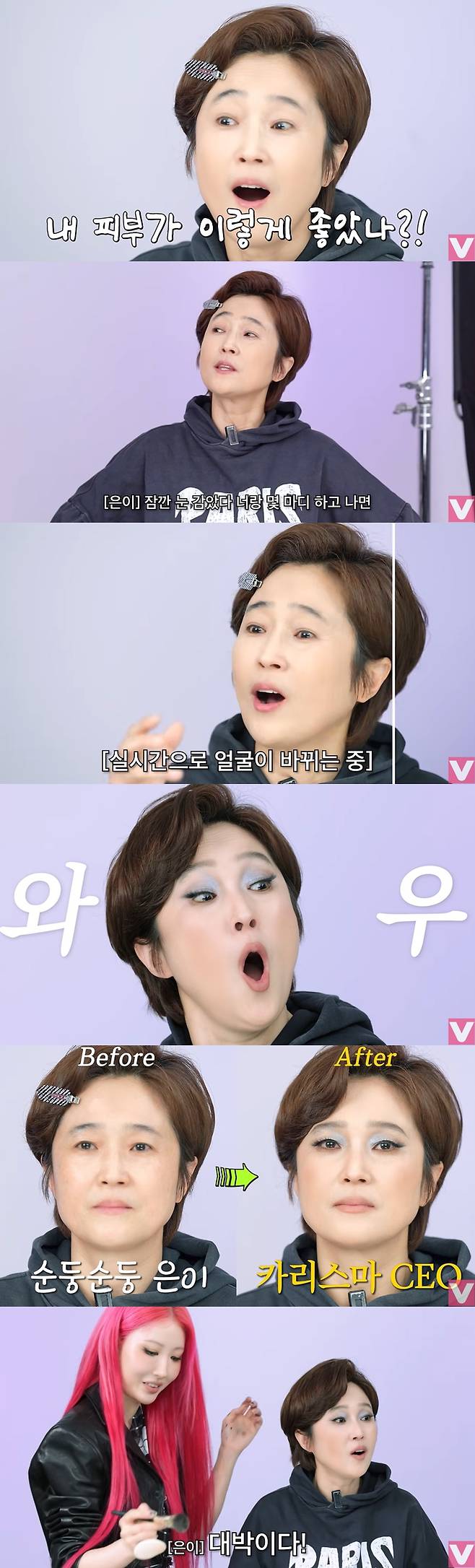 메이크업이 마무리되자 송은이는 자신의 모습을 보더니 "와!"라며 박수를 쳤고, "대박이다"라고 감탄했다.