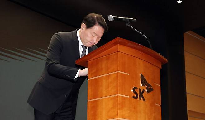 ▲ 최태원 SK그룹 회장이 7일 서울 중구 SK텔레콤 T타워에서 열린 유심 정보 유출 관련 일일 브리핑에 참석, 정보 유출과 관련해 대국민 사과를 하고 있다.
