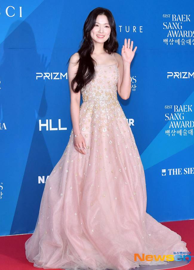 이날 자리에 참석한 김혜윤은 노란색, 하얀색 꽃잎이 흩뿌려진 듯한 디자인의 연한 핑크 컬러 튜브톱 드레스를 입고 현장을 빛냈다.