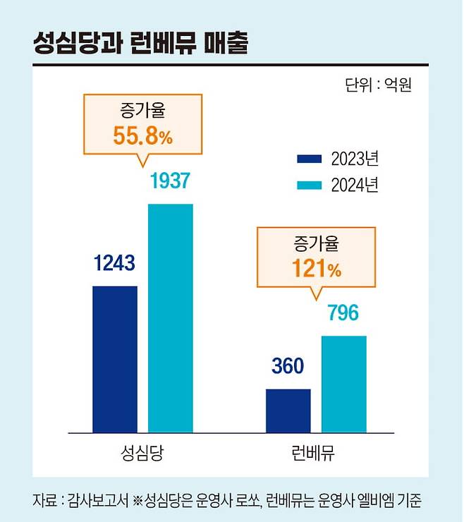 성심당의 운영사인 로쏘의 매출은 작년에 1900억원을 넘겼어요. 전년 대비 56%나 증가했습니다. 영업이익은 470억원가량을 거뒀는데 이 또한 52% 늘어난 것이고요. 런던베이글의 성장폭은 더 컸어요. 런던베이글의 운영사인 엘비엠의 작년 매출은 무려 121% 증가했어요. 800억원에 육박했죠. 영업이익도 두 배 가까이 늘어 240억원을 넘겼고요.