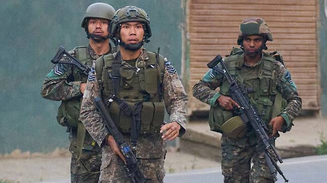 ▲ 7일 무장한 인도 군인들이 인도령 카슈미르 풀와마 지역에서 이동하고 있다.