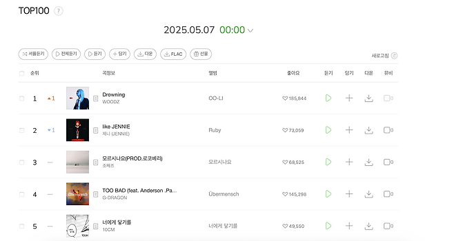 우즈는 자자곡 '드라우니'(Drowning)으로 7일 오전 12시 기준 멜론 메인 차트 톱100에서 1위를 기록했다. 이 곡은 지난해 10월 해당 차트에 첫 진입했다.