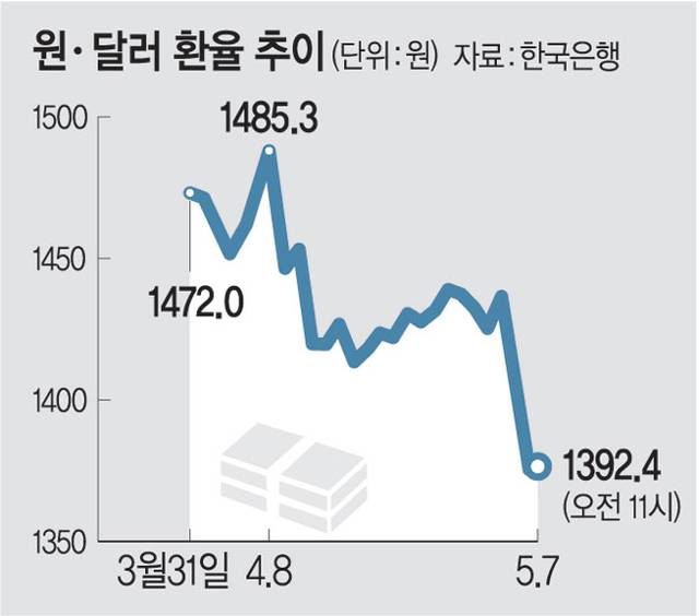 7일 서울 외환시장에서 원·달러 환율은 전장 대비 25.3원 급락한 1380.0원에 주간거래를 시작한 후 오전 11시 현재 1392.4원을 기록하고 있다. 이런 낙폭은 지난달 14일 낙폭(25.8원) 이후 최대치다.
