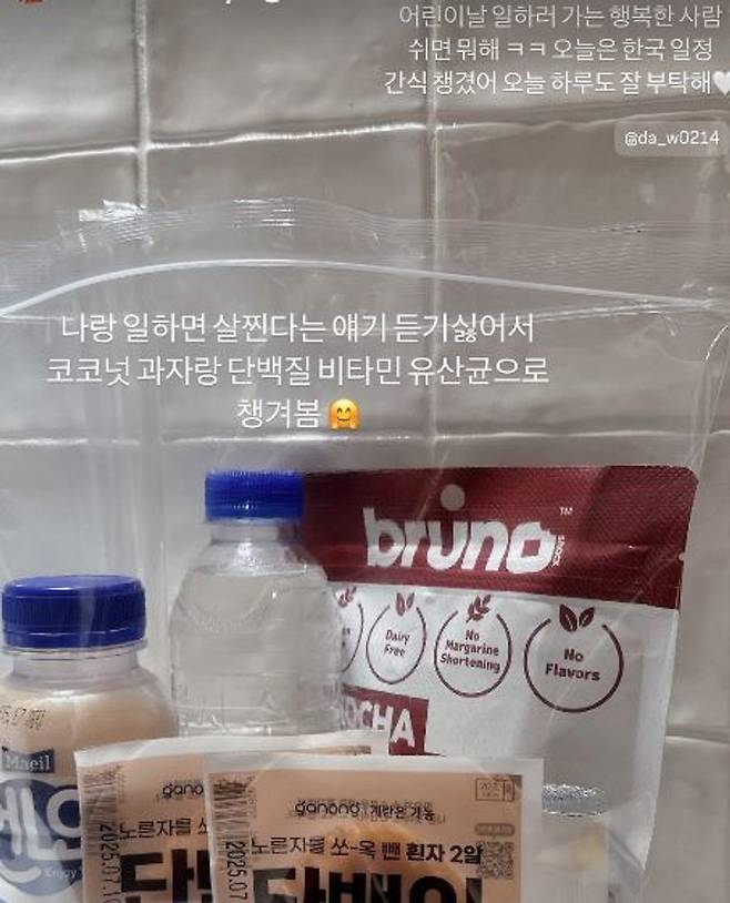 이국주는 지난 5일 개인 계정에 "어린이날 일하러 가는 행복한 사람. 쉬면 뭐 해. 오늘은 한국 일정"이라는 글과 함께 간식 사진을 공개했다. 코코넛 과자, 단백질, 비타민, 유산균 등 건강 간식으로 채운 사진과 함께 "나랑 일하면 살찐다는 얘기 듣기 싫어서"라며 스타일리스트에 대한 배려를 전하기도 했다.