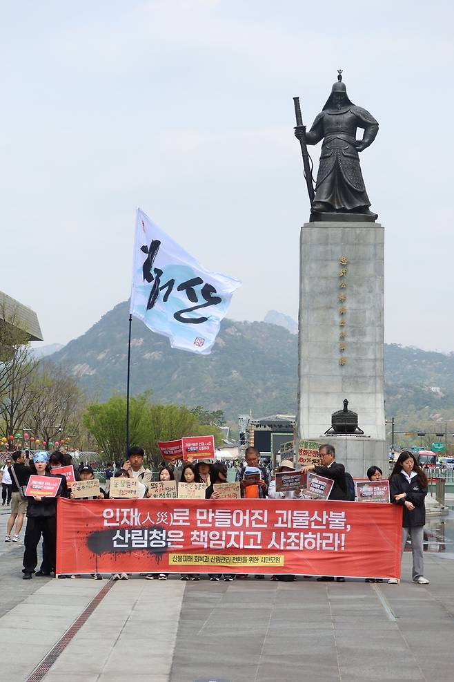 | ▲ 지난 4월 17일에는 서울 광화문광장에서 지리산사람들, 불교환경연대, 경남환경운동연합, 대구환경운동연합, 서울환경연합 등 61개 시민사회단체가 함께하는 ‘산불피해 회복과 산림관리 전환을 위한 시민모임’이 ‘괴물산불’을 불러온 산림청을 규탄하고 사죄를 촉구하는 기자회견을 열었다. |