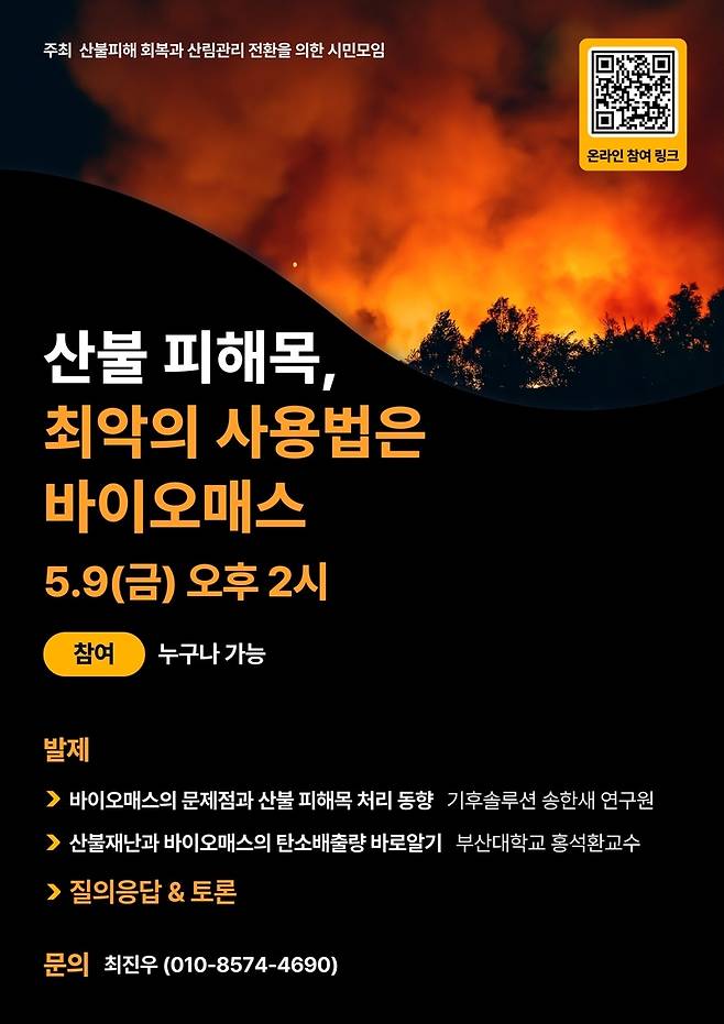 | ▲ ‘산불피해 회복과 산림관리 전환을 위한 시민모임’에서는 오는 9일(금) 오후 2시 대형 산불이 발생하면 생기게 마련인 산불 피해목을 그간 산림청에서 모두베기해서 뗄감용 우드칩으로 화력발전소에 공급해오던 것에 대한 문제제기로 “산불피해목, 최악의 사용법은 바이오매스” 주제의 온라인 토론회를 개최한다. |
