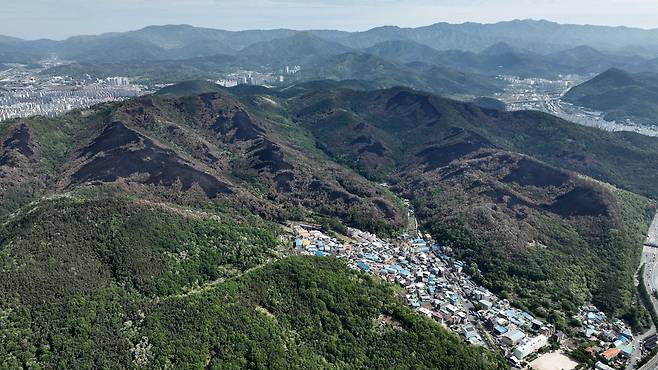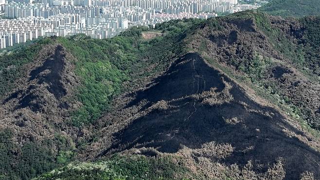 | ▲ 봄비로 불이 완전히 진화되고 난 후의 5월 5일 대구 함지산 산불 현장. 함지산 주변에 아파트와 주택 등 민가가 밀집해 있어서 자칫 초대형 산불 피해가 발생할 뻔했다. |