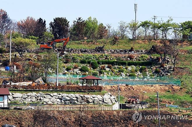 (영덕=연합뉴스) 손대성 기자 = 지난 3월 대형산불 피해가 난 경북 영덕군 영덕읍 노물리에서 7일 중장비 작업자가 폐기물을 치우고 있다. 2025.5.7