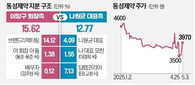 이 회장은 최근 인터뷰에서 “시중은행, 사모펀드(PEF) 등 백기사와 개인투자자 등을 통해 30% 이상의 우호 지분을 확보했다”며 “임시 주총을 열어 현 대표이사 및 이사진을 교체하겠다”고 밝힌 바 있다. 그는 지난 4월 21일 보유하고 있던 동성제약 지분 14.12% 전량을 마케팅 전문기업 브랜드리팩터링에 매각하는 계약을 체결하며 경영권 분쟁의 불씨를 지폈다. 이 회장측 지분은 브랜드리팩터링 지분 14.12%를 포함해 이 회장 아들 용훈 씨 지분 1.26%, 용준 씨 지분 0.12%, 배우자 김주현 씨 지분 0.12% 등으로 총 15.62%다. 나 대표측 지분율은 본인 4.09%에 모친인 이경희씨와 딥랩코리아 등을 포함해 총 12.77%다.