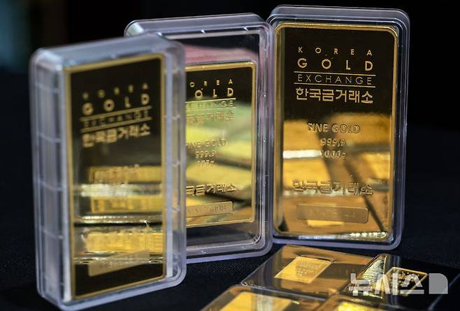 국제 금 가격이 다시 사상 최고치에 근접하고 있다. 은행권에 따르면 골드뱅킹을 판매하는 KB국민, 신한, 우리은행 등 시중은행 3곳의 골드뱅킹 잔액은 지난달 말 기준 1조1025억원으로 집계됐다. 이는 1년 전인 지난해 4월 말 잔액 6101억원 대비 4924억원(80.7%) 급증한 것으로 역대 최대 규모다. 7일 기준 한국거래소(KRX) 금 시장에서 1㎏짜리 금 현물은 1g당 15만1650원에 거래되고 있다. 국제 금값은 지난달 22일(현지시간) 현물 기준 온스당 3500달러를 돌파해 사상 최고치를 기록한 뒤 다시 3400달러를 넘어서며 최고치에 근접하고 있다. 2025.05.07. jhope@newsis.com