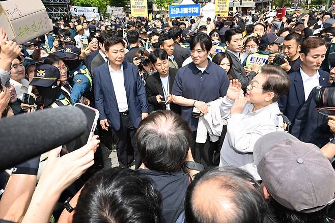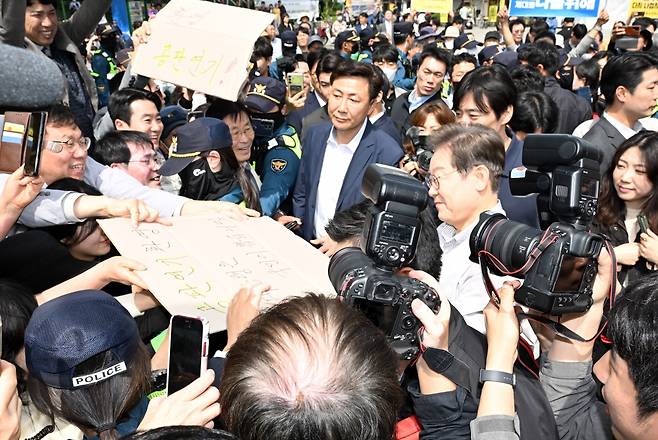 이재명 더불어민주당 대선 후보가 7일 전북 전주시 풍남문 일대에서 공판연기 손팻말을 보고 화답하고 있다. 이 후보는 지지자가 쓴 손팻말에 ‘맞습니다’라고 적는 모습도 보였다.