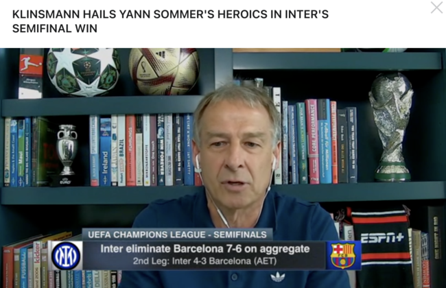 한국대표팀 감독직에서 경질된 클린스만은 요즘도 ESPN 패널로 활약하고 있다. 그는 친정팀 인터 밀란의 챔스 결승진출에 또 마이크를 들었다. 그는 “조모가 아주 잘했다. 치명적인 선방을 해내 밀란을 결승으로 이끌었다. 특히 2차전 선방은 대단했다. 바르셀로나를 끝냈다”면서 조머를 크게 칭찬했다.