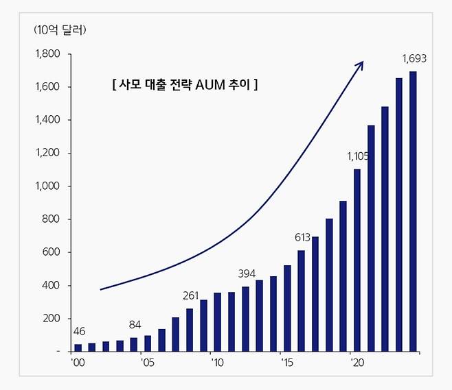 기업 입장에서는 은행에서 돈을 빌리는 것보다 사모대출 펀드를 통해 자금을 조달하는 것이 여러모로 유리한 점이 많기 때문에 사모대출 시장은 빠른 성장세를 기록했습니다. 2000년 기준 463억달러 규모이던 사모대출펀드 규모는 2024년 9월 기준 1.7조달러 규모로 무려 35.6배 성장했습니다.