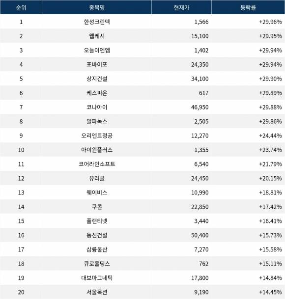 6위 케스피온(079190)은 종가 617원으로 +29.89% 상승 마감했다. 7위 코나아이(052400)는 종가 46,950원으로 +29.88% 상승 마감했다. 8위 알파녹스(043100)는 종가 2,505원으로 +29.86% 상승 마감했다. 9위 오리엔트정공(065500)은 종가 12,270원으로 +24.44% 상승 마감했다. 10위 아이윈플러스(123010)는 종가 1,355원으로 +23.74% 상승 마감했다.