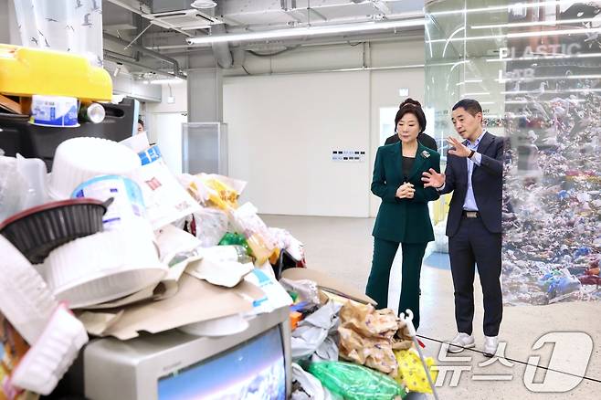 (서울=뉴스1) = 오영주 중소벤처기업부 장관이 7일 경기 화성 수퍼빈에서 열린 '기후테크 스타트업 현장대화' 참석에 앞서 기업 현장을 둘러보고 있다. (중소벤처기업부 제공. 재판매 및 DB 금지) 2025.5.7/뉴스1