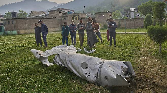 ▲ 7일 인도령 카슈미르 지역에서 금속 파편이 바닥에 널브러져 있다.