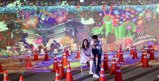 7일 서울 종로구 도화서길 디원에서 '2025 딜라이트 서울' 미디어아트 전시 언론공개 행사에서 모델들이 전시 작품을 소개하고 있다.